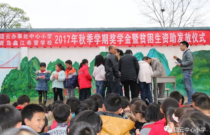 為了讓貧困生更安心于學業,讓成績優秀的學生在新學期能更上一層樓,2018年3月7日下午,頂云中心小學舉行“頂云中心小學(青島鑫江希望小學)2017年秋季學期青島鑫江慈善基金會貧困生助學金暨獎學金發放儀式”活動。