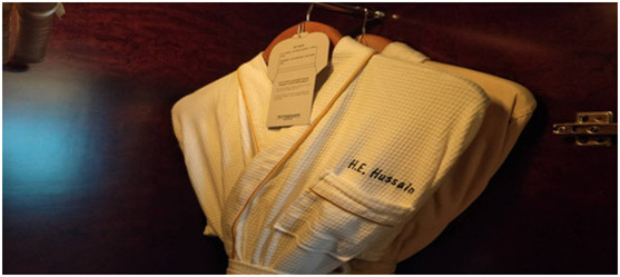 接待前,酒店提前獲取到了總統先生身材的信息,為總統閣下定做了一套浴袍,一套睡衣,并在上面繡上了馬姆努恩.侯賽因總統閣下的名字,總統閣下入住后非常驚喜。