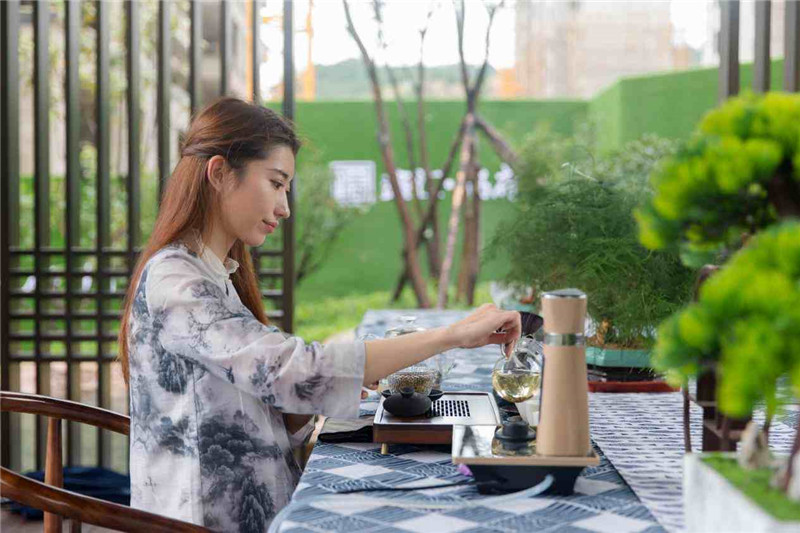 雨中的歆湖云霧繚繞,臥虹橋仿佛在訴說一段古老而美麗的故事。中式園林中,身著精美古裝的佳人仕女,曼妙若畫,在旖旎的禮樂中上演一曲醉人如夢,將示范區的東方之美和風華絕代淋漓盡致地展現于眼前。攬勝軒內,精心準備的茶藝表演讓在場嘉賓沉醉其中,品茗、賞景、談笑風生。