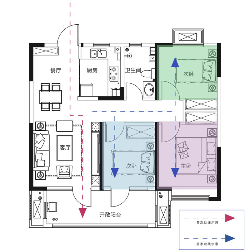 對(duì)于進(jìn)階中的家庭來(lái)說(shuō):從二人世界到三口之家、三代同堂的跨越,每個(gè)階段中不僅要有情感交流,更需要面對(duì)獨(dú)立居住功能的要求,聚而不分的三室便是最舒適的禮遇,承接著每個(gè)人對(duì)空間功能的需求,鑫江·花漾里,百fen百深入探究人本空間煥新升級(jí)·百fen百空間·功能三居戶型,禮獻(xiàn)幸福人生。