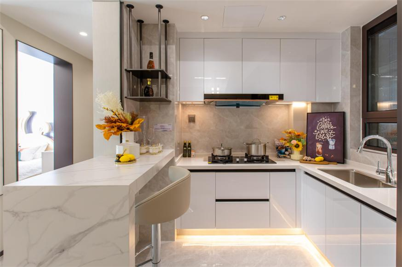 為家人烹飪美食,滿足一家人的味蕾。方正空間搭配L型布局,空間實(shí)用,黃金動(dòng)線,流暢操作,半開(kāi)放式吧臺(tái),打造一個(gè)便捷早餐、品味下午茶的臨時(shí)場(chǎng)所,廚房空間早已成為一條拉近夫妻感情距離的隱形紐帶。