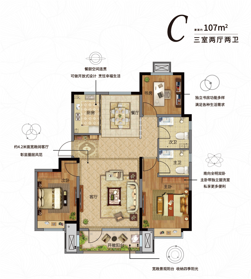 全明方正戶型,南北通透,瞰景寬綽陽臺,與家人一同共享四季景致的更替和全齡社區(qū)的活力。超尺度陽臺,除了晾曬、瞰景等常規(guī)功能外,多功能空間布局,匹配家庭每位成員的生活渴望。舒適主臥配備瞰景飄窗,締造生活儀式感;部分實景現房交付,即買即入住,幸福不必等待。